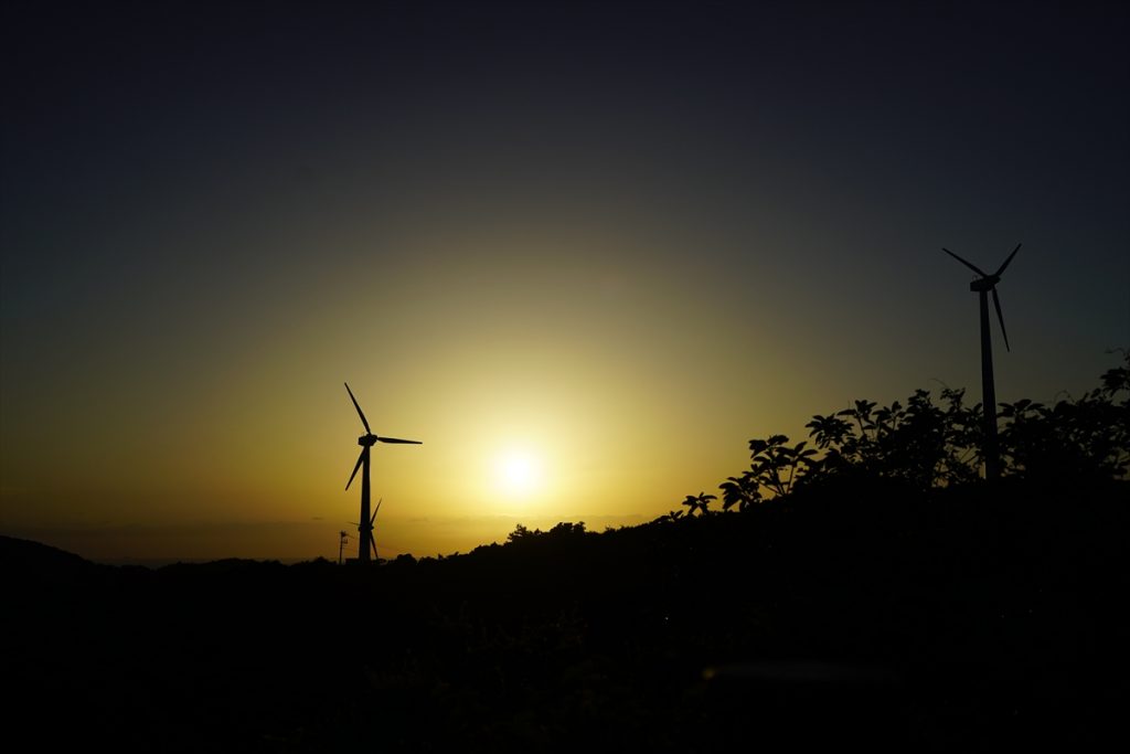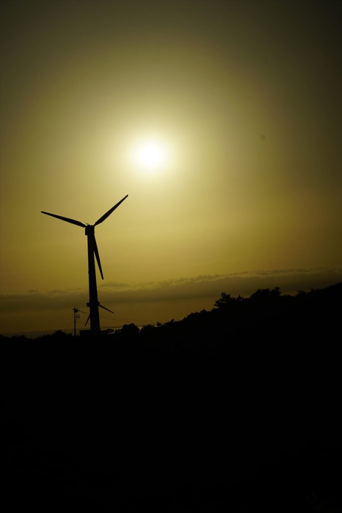 夕陽が近づくにつれて、風力発電の風車も素敵なシルエットに。