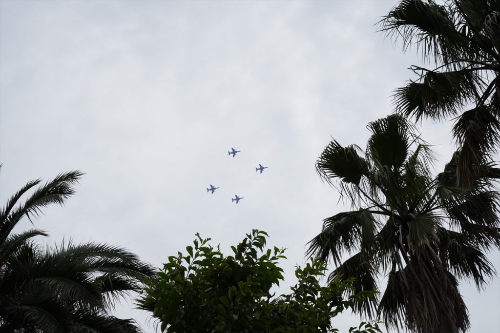画面右の斜めに入った飛行機雲がブルーインパルスです。